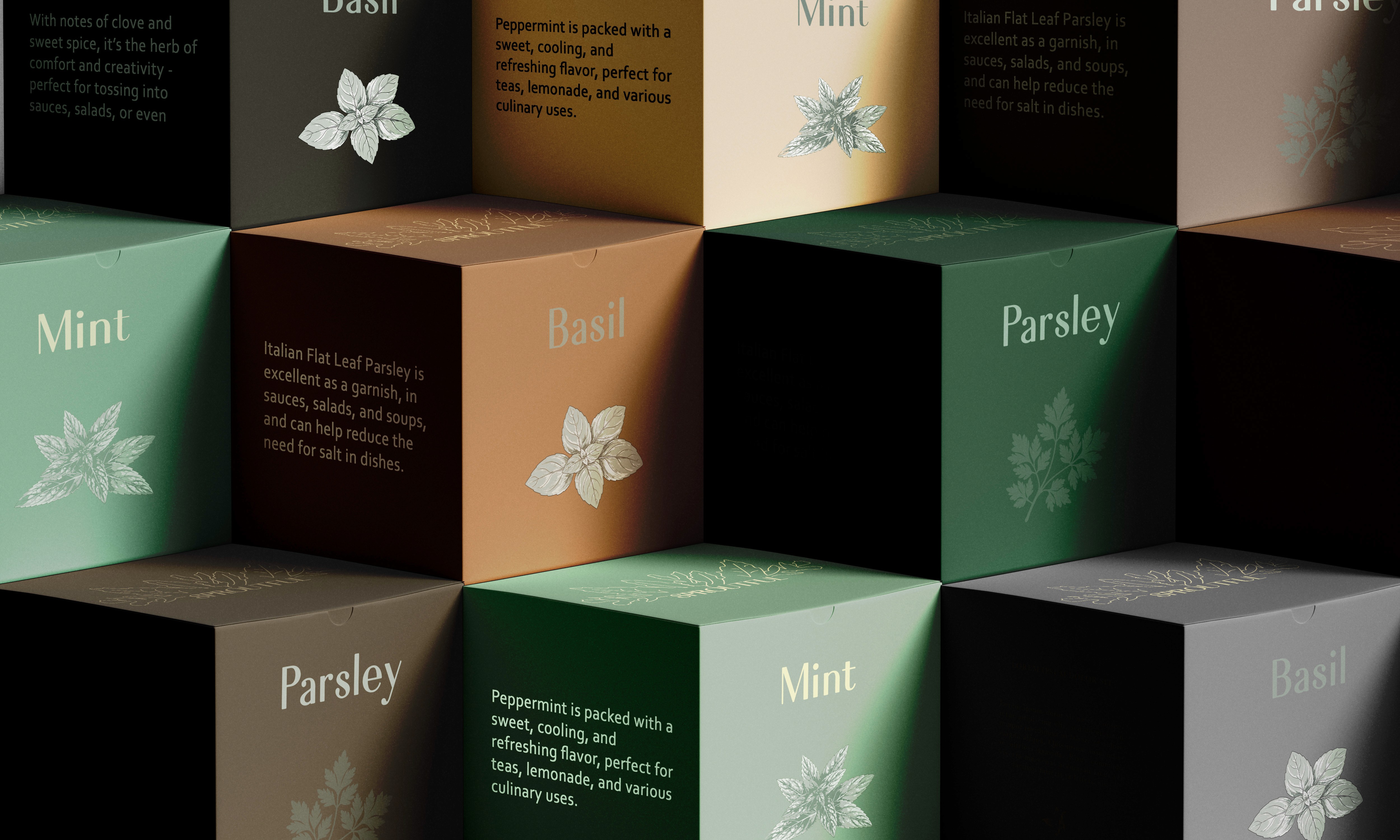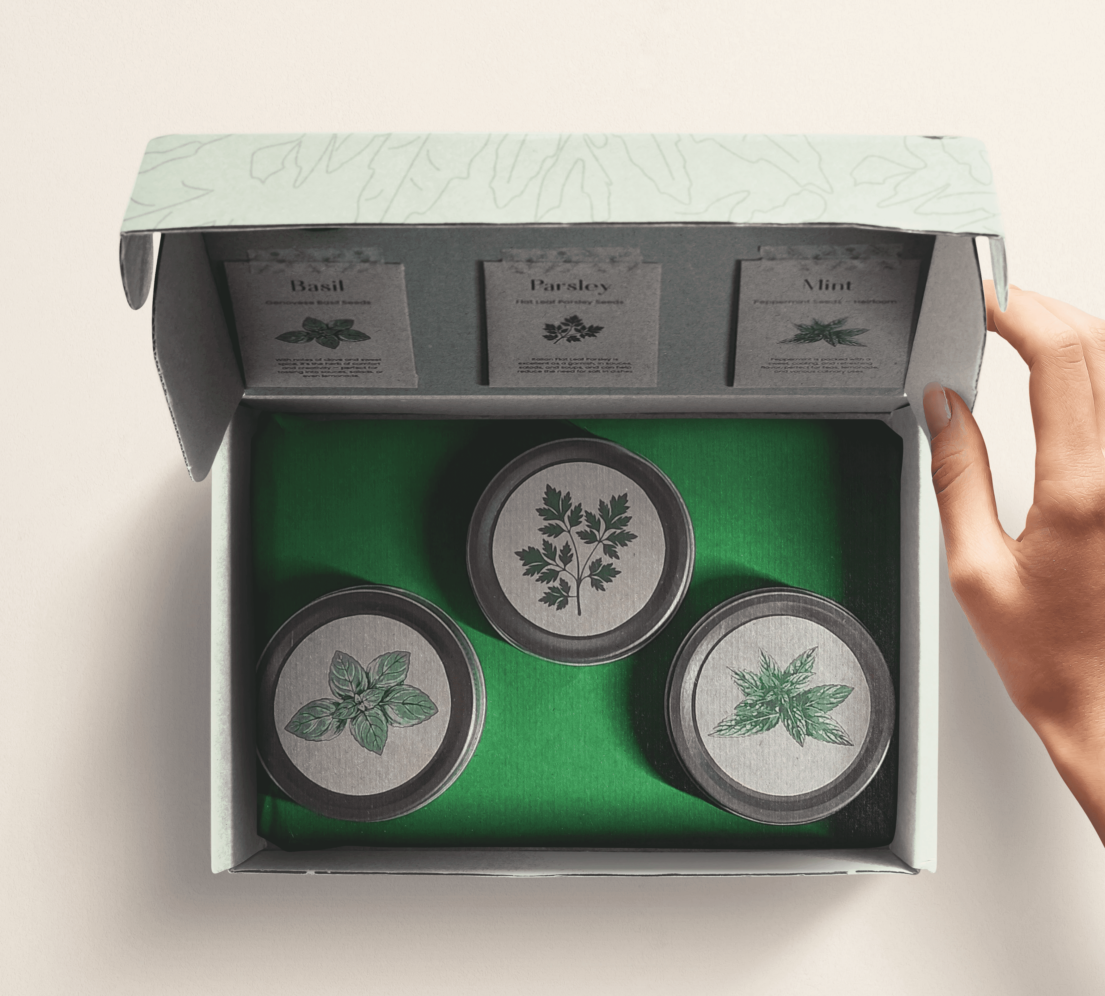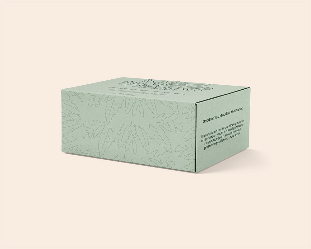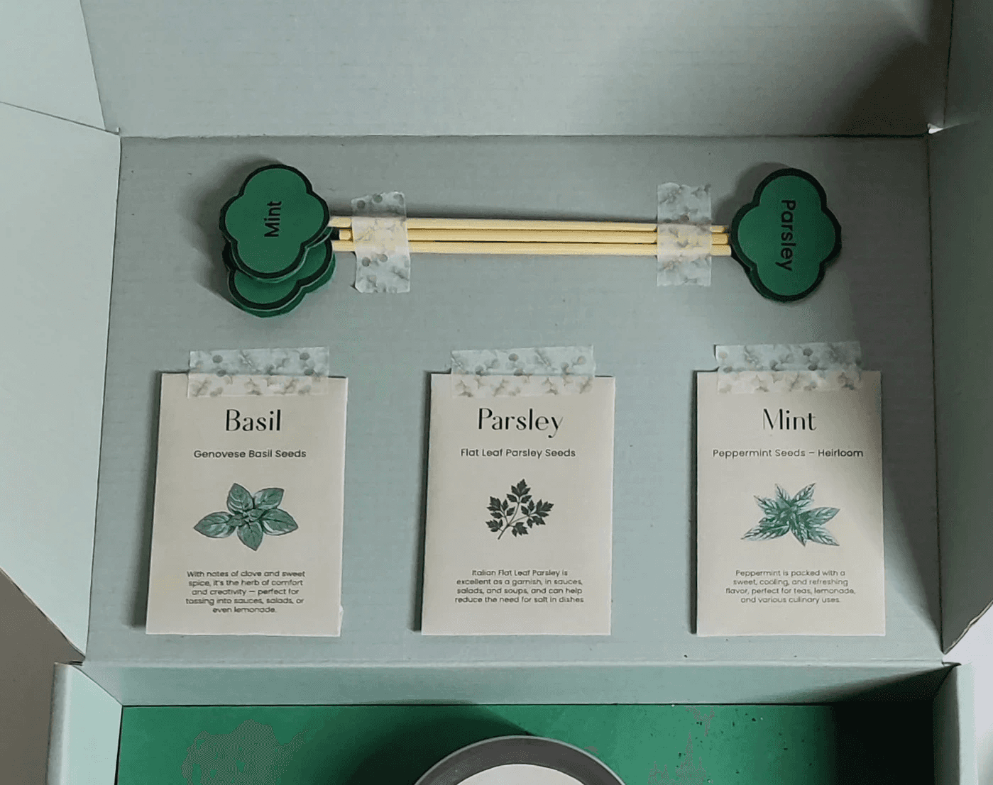 The kit includes all necessary components, presented as branded and visually coordinated elements to promote clarity and ease of use. Practical considerations were also integrated into the design. A protective plastic tray addresses potential water damage, and individually labeled containers maintain herb identification even if the outer packaging is removed. The result is a cohesive product system that prioritizes usability, durability, and visual appeal.